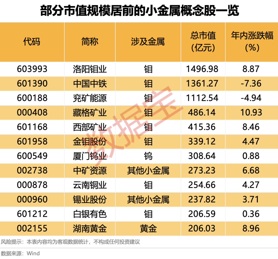 据证券时报·数据宝统计,涉及钨、碲、铋、钼、铟等小金属的概念股有30余只,包含千亿市值规模的洛阳钼业、中国中铁、兖矿能源。
