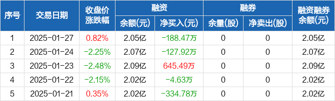 融资方面,当日融资买入479.88万元,融资偿还668.35万元,融资净偿还188.47万元。融券方面,融券卖出0股,融券偿还0股,融券余量0股,融券余额0元。融资融券余额合计2.05亿元。