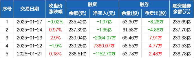 中国平安融资融券信息显示,2025年1月27日融资净偿还1.97亿元;融资余额235.42亿元,较前一日下降0.83%。