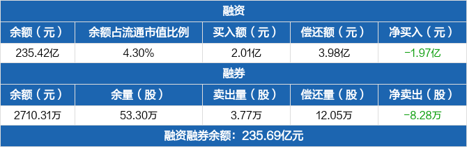 融资方面,当日融资买入2.01亿元,融资偿还3.98亿元,融资净偿还1.97亿元,净偿还额两市排名第12,连续3日净偿还累计3.83亿元。融券方面,融券卖出3.77万股,融券偿还12.05万股,融券余量53.3万股,融券余额2710.31万元。融资融券余额合计235.69亿元。