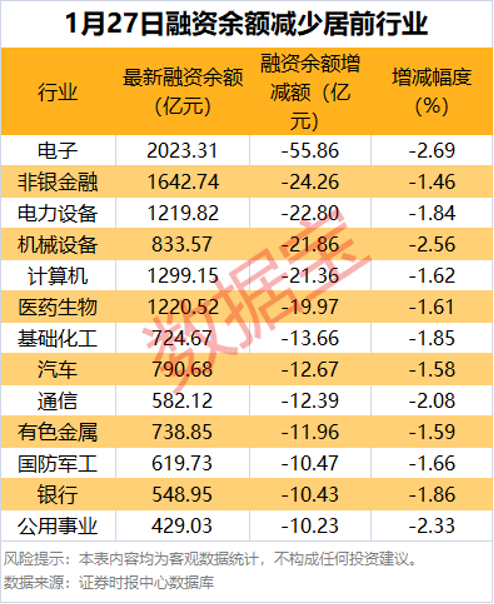 分行业统计,申万所属一级行业融资余额全部呈减少态势,电子、非银金融、电力设备等行业融资余额减少较多,分别减少55.86亿元、24.26亿元、22.80亿元。