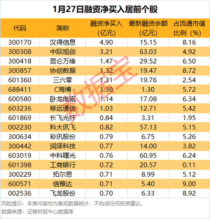 汉得信息融资净买入额居首,当日净买入4.9亿元;其次是中际旭创、昆仑万维,融资净买入金额分别为3.21亿元、1.47亿元。融资净买入金额居前的还有协创数据、三六零、C海博等。