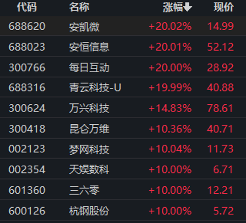 从股价表现看,三六零今日开盘一字涨停,拓尔思“20cm”涨停,卧龙电驱盘中触及涨停,昆仑万维涨超10%。