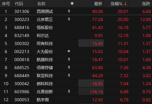 上证报中国证券网讯 2月5日午后,存储芯片概念股拉升,截至13时14分,西测测试、北京君正20cm涨停,大为股份涨停,恒烁股份、同有科技、利尔达涨超10%,朗科科技、兆易创新等跟涨。此前,航锦科技涨停。