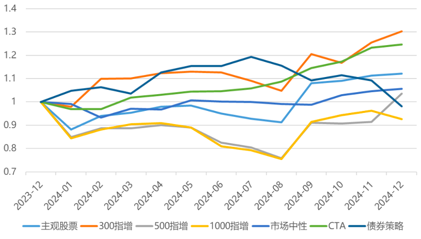 回顾2024年全年,私募各策略规模有所分化。其中,300指增规模的上涨最为显著,一方面是因为300指数在各类宽基指数中表现突出,另一方面是2024年300指增产品新成立发行较多。