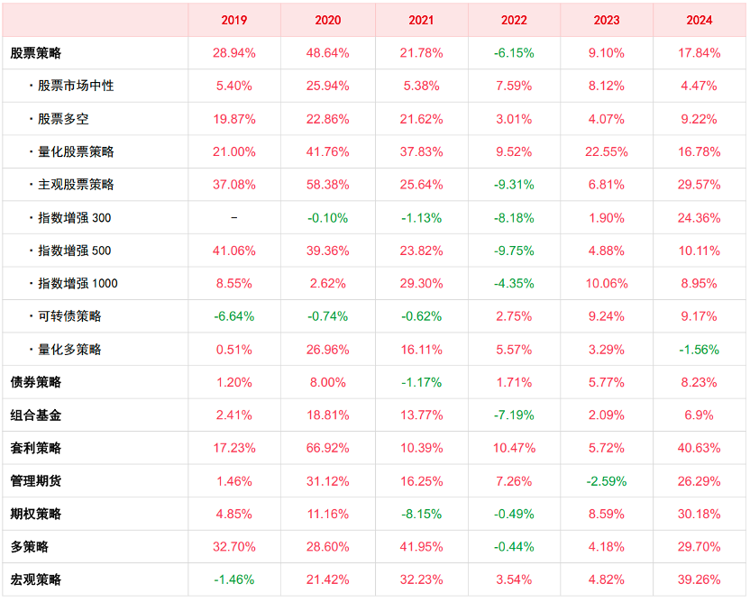据中信建投托托管部外包产品数据,2024年股票策略全年上涨17.84%,其中主观股票策略的涨幅甚至接近30%。不过,量化多策略全年亏损1.6%。