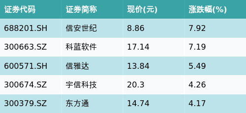 截至收盘,跨境支付(CIPS)主题涨跌幅最高的五只股票为:信安世纪(688201.SH)、科蓝软件(300663.SZ)、信雅达(600571.SH)、宇信科技(300674.SZ)与东方通(300379.SZ)。详情见下表:
