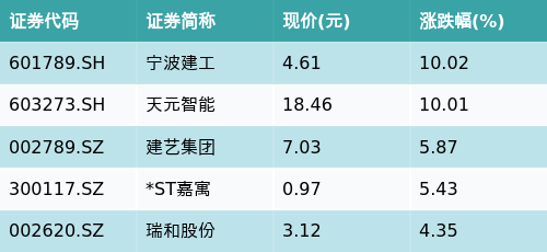 截至收盘,装配式建筑主题涨跌幅最高的五只股票为:宁波建工(601789.SH)、天元智能(603273.SH)、建艺集团(002789.SZ)、*ST嘉寓(300117.SZ)与瑞和股份(002620.SZ)。详情见下表: