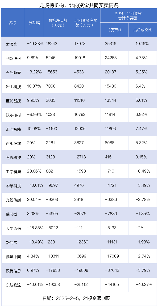 值得注意的是,机构和北向资金共同净买入了利欧股份、太辰光、巨轮智能、沃尔核材、岩山科技、五洲新春、首都在线等7股;共同净卖出了天孚通信、瑞芯微、视觉中国、汉得信息、东航物流等5股;在汇洲智能、华懋科技、光线传媒、卫宁健康、万兴科技、新易盛上出现分歧,机构净卖出汇洲智能1099.72万元,北向资金净买入1.29亿元;机构净卖出华懋科技9697.35万元,北向资金净买入4976.39万元;机构净卖出光线传媒9303.44万元,北向资金净买入2917.54万元;机构净买入卫宁健康882.33万元,北向资金净卖出1598.36万元;机构净买入万兴科技3127.85万元,北向资金净卖出2712.61万元;机构净买入新易盛1238.2万元,北向资金净卖出1.24亿元。
