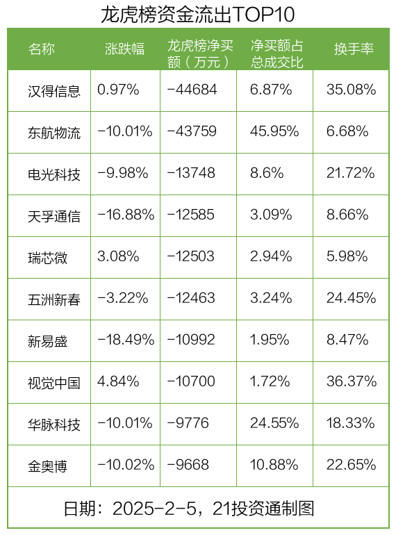 而龙虎榜中资金净流出最多的是汉得信息(300170.SZ),被净卖出为4.47亿元,占总成交金额的6.87%。汉得信息收盘上涨0.97%,换手率为35.08%。
