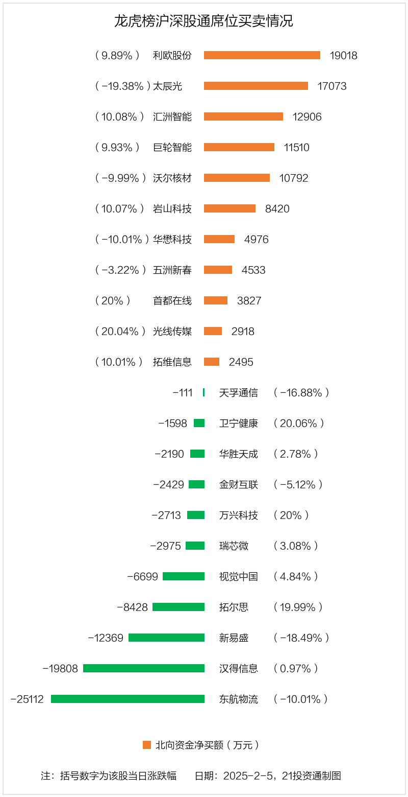 2月5日,北向资金参与龙虎榜中的个股共有22只,合计净买入1.4亿元。其中沪股通净买入2 股,净卖出3 股,合计净卖出2.08亿元;深股通净买入9 股,净卖出8 股,合计净买入3.48亿元。