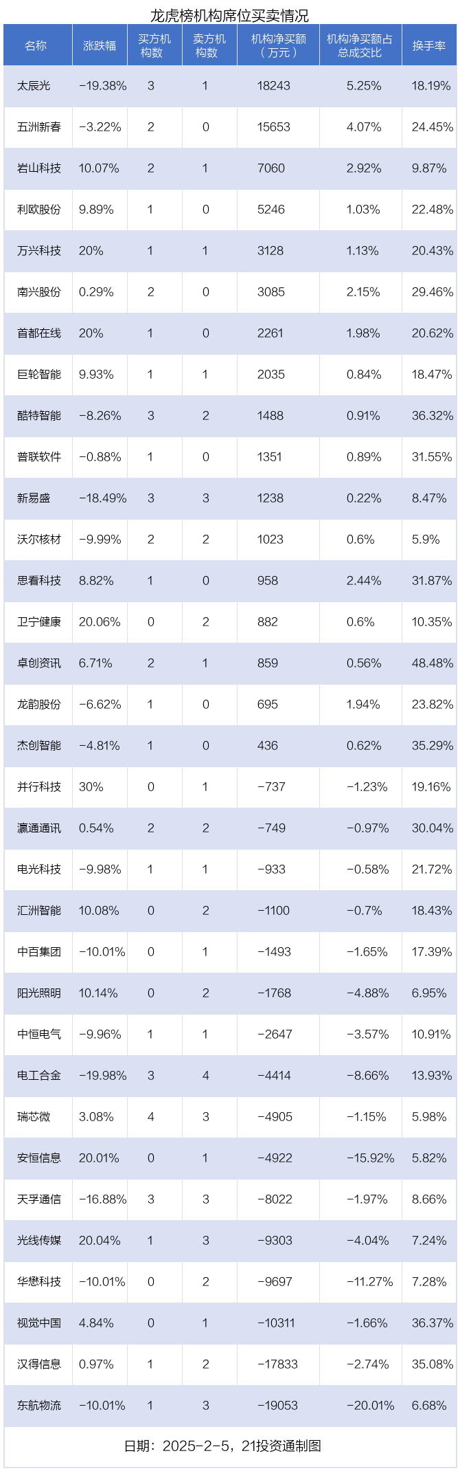 2月5日,33只个股龙虎榜出现了机构的身影,机构合计净卖出3.22亿元。具体来看,机构净买入17股,净卖出16股。