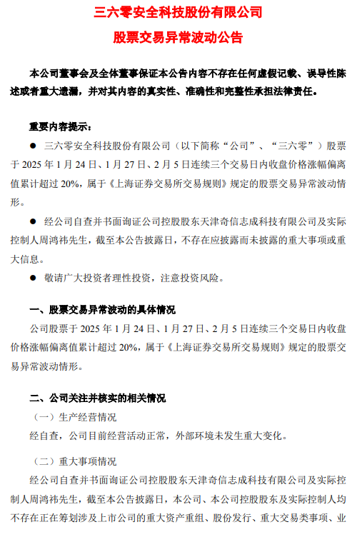 三六零发布异动公告称,公司注意到相关平台将公司股票纳入DeepSeek概念股。公司就相关事项澄清说明如下:在DeepSeek基于MIT开源协议的生态环境下,公司旗下的部分产品进行了DeepSeek的接入与本地化部署;公司暂未向DeepSeek提供任何服务。