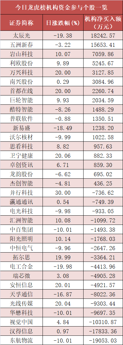 盘后龙虎榜数据显示,机构现身多股,其中太辰光等股票呈现机构资金净买入,东航物流等股票呈现机构资金净卖出。