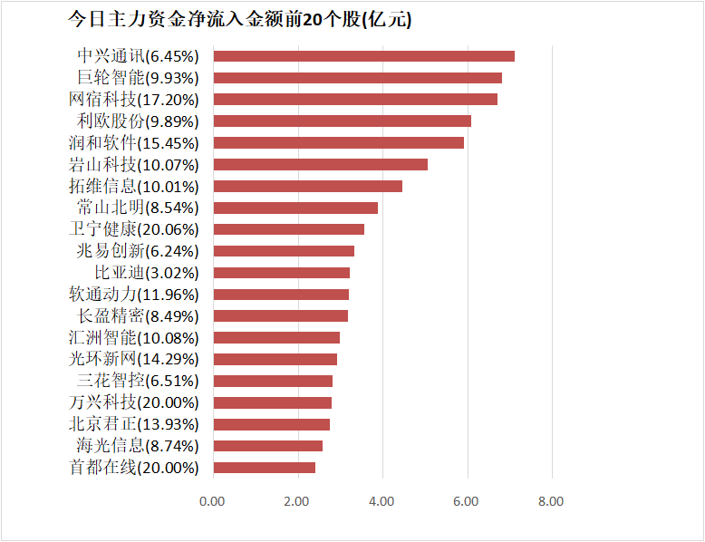 4.中兴通讯主力资金净流入7.12亿元居首
