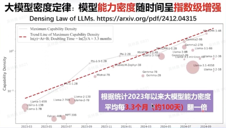 过去几年,我们可以看到类似摩尔定律的现象,大模型的能力密度正随时间呈指数级增强。2023年以来,大模型的能力密度大约每100天翻一倍。也就是说,每过100天,我们只需要一半的算力和一半的参数就能实现相同的能力。