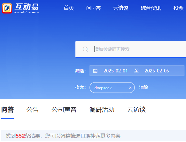 在投资者互动平台上,不少公司被密集提问现有业务与DeepSeek的关联度。在深交所互动易上,2月前5天,有关DeepSeek的搜索结果就有552条,DeepSeek已然成为互动易上的热门搜索词。