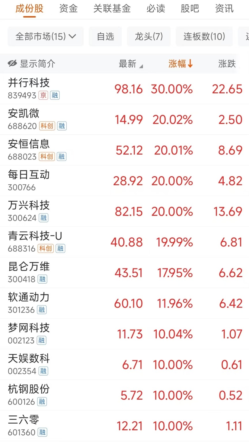 除了三六零,DeepSeek概念周三集体火爆,板块掀起涨停潮。并行科技30CM涨停;安凯微、安恒信息、每日互动、万兴科技、青云科技20CM涨停。