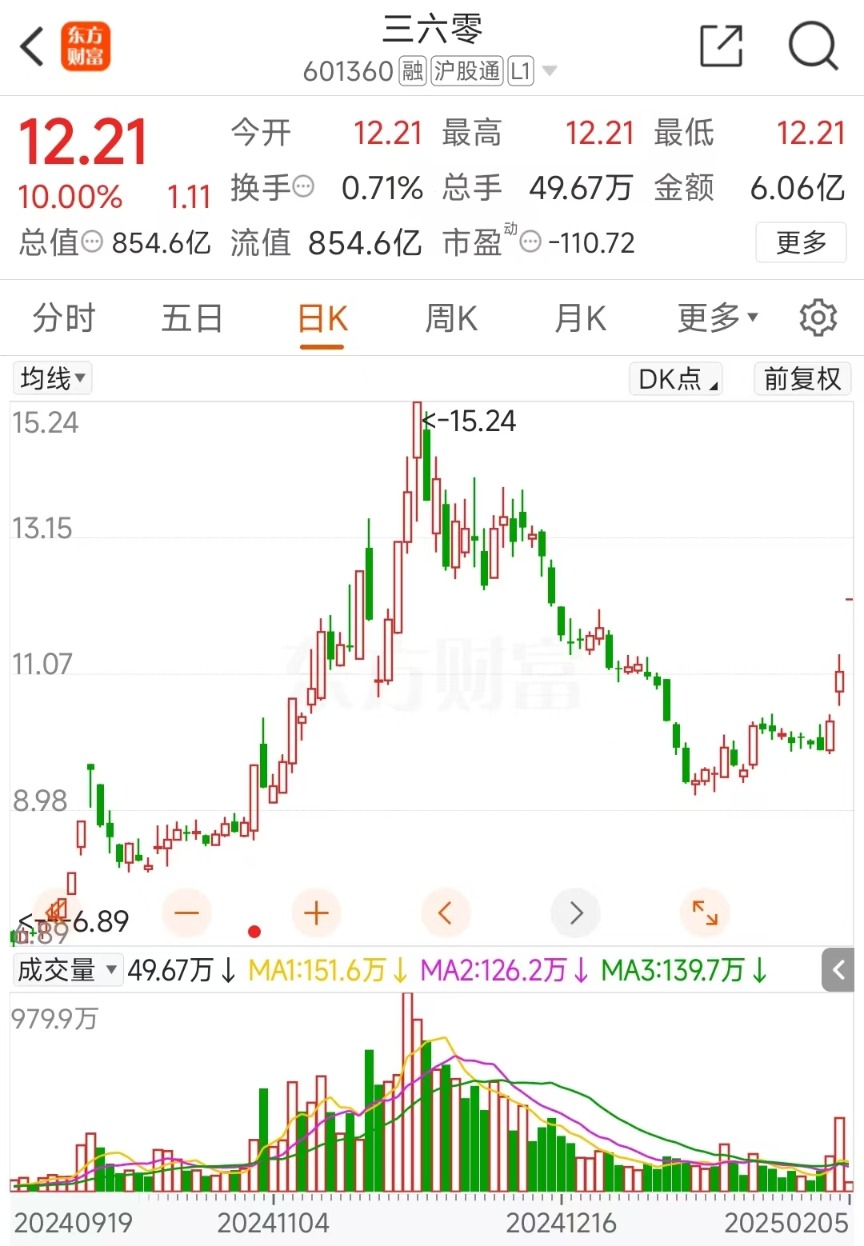 看个股的话,三六零周三一字涨停,收盘时封单金额高达17.31亿元。近三个交易日,三六零连续收阳,累计上涨23.33%。截至2月5日收盘,三六零最新市值为854.6亿元,股东户数为35.56万户。
