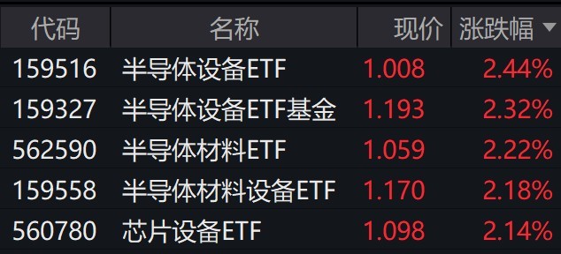受重仓股上涨影响,跟踪中证半导体材料设备主题指数的ETF普涨逾2%。
