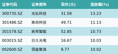 截至午间收盘,消费电子概念主题涨跌幅最高的五只股票为:光弘科技(300735.SZ)、致尚科技(301486.SZ)、辰奕智能(301578.SZ)、日久光电(003015.SZ)与领益智造(002600.SZ)。详情见下表:
