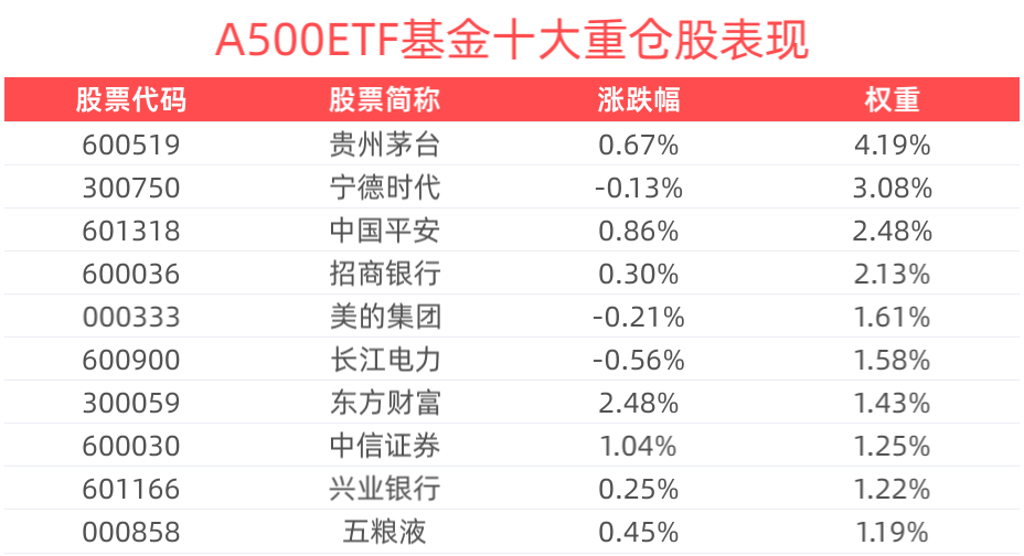 数据显示,截至2025年1月27日,中证A500指数(000510)前十大权重股分别为贵州茅台(600519)、宁德时代(300750)、中国平安(601318)、招商银行(600036)、美的集团(000333)、长江电力(600900)、兴业银行(601166)、东方财富(300059)、紫金矿业(601899)、中信证券(600030),前十大权重股合计占比20.32%。