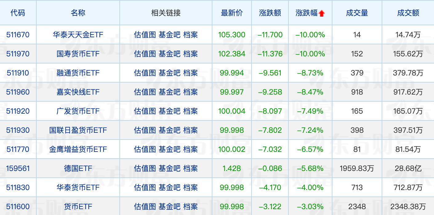 下跌方面,春节后A股开盘首日(2月5日),9只货币ETF发布停牌公告,多只货币ETF全天按下“暂停键”。2月6日开盘,货币ETF大幅回调,华泰天天金ETF、国寿货币ETF跌停,货币ETF悉数回撤。