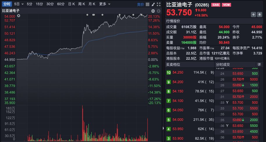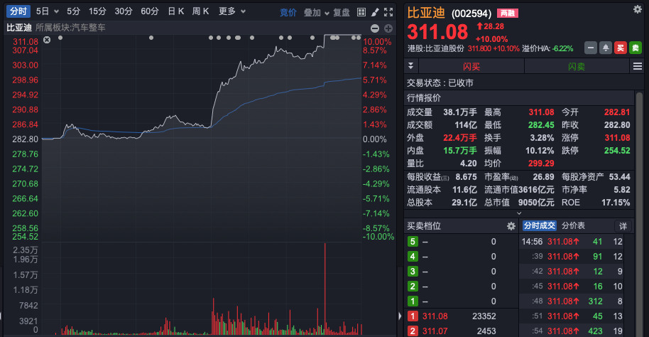 市场焦点方面,比亚迪午后开盘放量拉升封死涨停,成交猛增至逾114亿元,较昨日增加1倍多,换手率3.28%。这是比亚迪自2021年8月近3年半以来再度涨停。