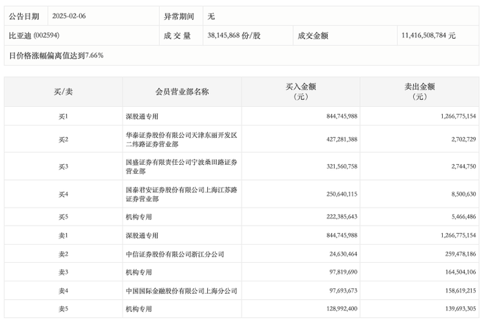 2月6日,比亚迪今日涨停,成交额114.17亿元,换手率3.28%,盘后龙虎榜数据显示,深股通专用席位买入8.45亿元并卖出12.67亿元,一机构净买入2.17亿元;二机构净卖出7738.53万元。