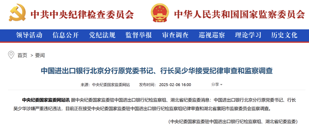 2月6日,中央纪委国家监委官网通报:中国进出口银行北京分行原党委书记、行长吴少华涉嫌严重违纪违法,目前正在接受中央纪委国家监委驻中国进出口银行纪检监察组纪律审查和湖北省襄阳市监察委员会监察调查。