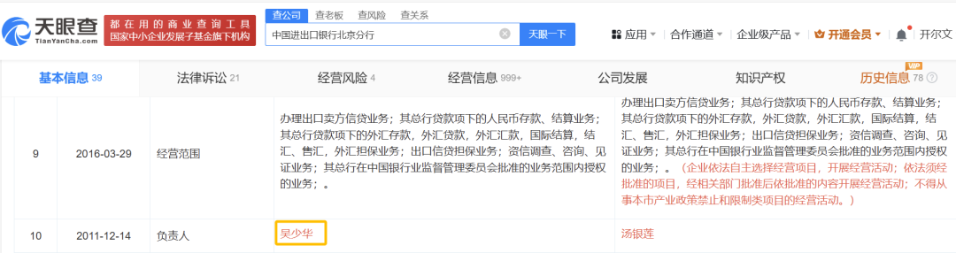 天眼查信息显示,吴少华于2009年8月登记为中国进出口银行北京分行负责人,2011年12月变更为他人。其间,吴少华曾以中国进出口银行北京分行行长的身份多次对外拜访、参加公开活动。
