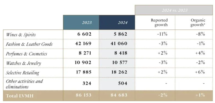 根据该集团最新公布的2024年度(2024年1月-12月)财报,LVMH集团2024年总体收入为846.83亿欧元,同比下滑2%;营业利润为195.71亿欧元,同比下滑14%。LVMH集团首席财务官Jean-Jacques Guiony 表示,这主要是因为汇率波动、成本增加等因素的影响。