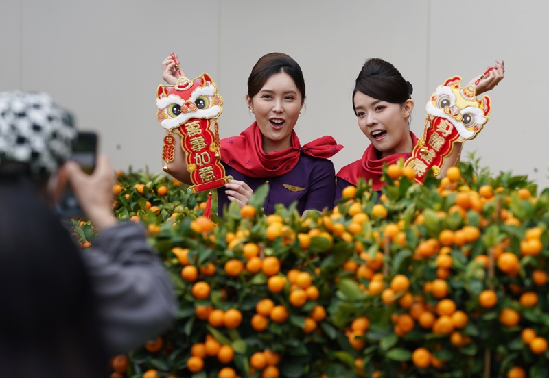 1月23日,在香港维多利亚公园年宵市场,穿着航空公司制服的女生在拍摄视频。 新华社发(王申摄)