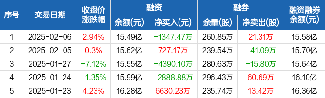 融资方面,当日融资买入4023.52万元,融资偿还5370.99万元,融资净偿还1347.47万元。融券方面,融券卖出36.87万股,融券偿还15.56万股,融券余量260.85万股,融券余额912.98万元。融资融券余额合计15.58亿元。