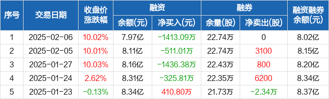 融资方面,当日融资买入3636.26万元,融资偿还5049.35万元,融资净偿还1413.09万元,连续4日净偿还累计3686.28万元。融券方面,融券卖出0股,融券偿还0股,融券余量22.74万股,融券余额462.08万元。融资融券余额合计8.02亿元。
