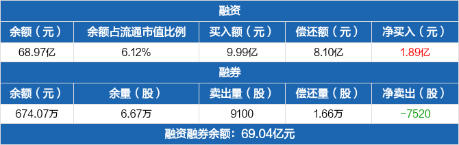 融资方面,当日融资买入9.99亿元,融资偿还8.1亿元,融资净买入1.89亿元,连续4日净买入累计11.29亿元。融券方面,融券卖出9100股,融券偿还1.66万股,融券余量6.67万股,融券余额674.07万元。融资融券余额合计69.04亿元。