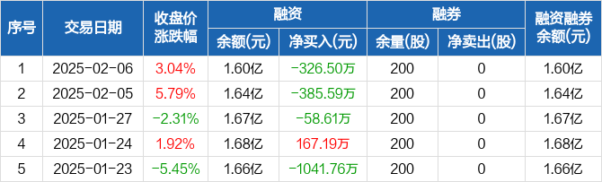 融资方面,当日融资买入824.68万元,融资偿还1151.17万元,融资净偿还326.5万元,连续3日净偿还累计770.69万元。融券方面,融券卖出0股,融券偿还0股,融券余量200股,融券余额1016元。融资融券余额合计1.6亿元。