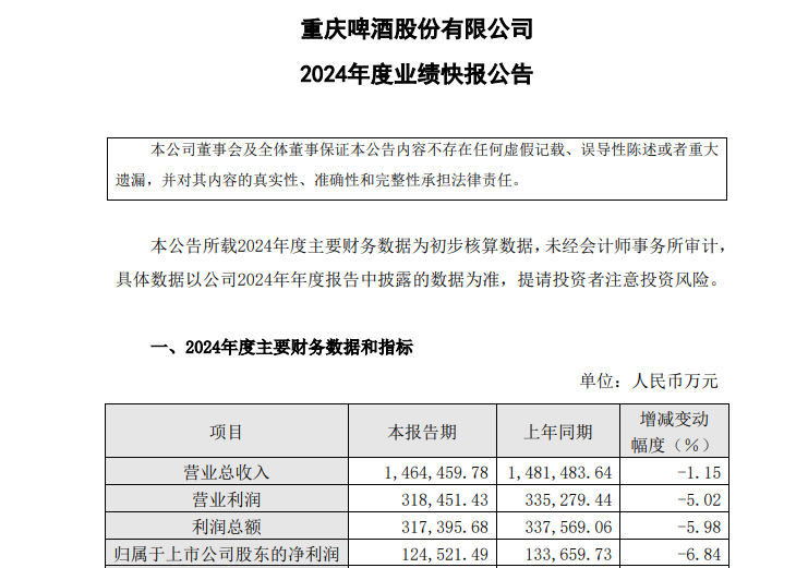 2月6日晚,主打高端啤酒的重庆啤酒(600132)发布2024年度业绩快报。报告期内公司营收146.4亿元,同比微降1.2%;归母净利润12.5亿元,同比下滑6.8%。
