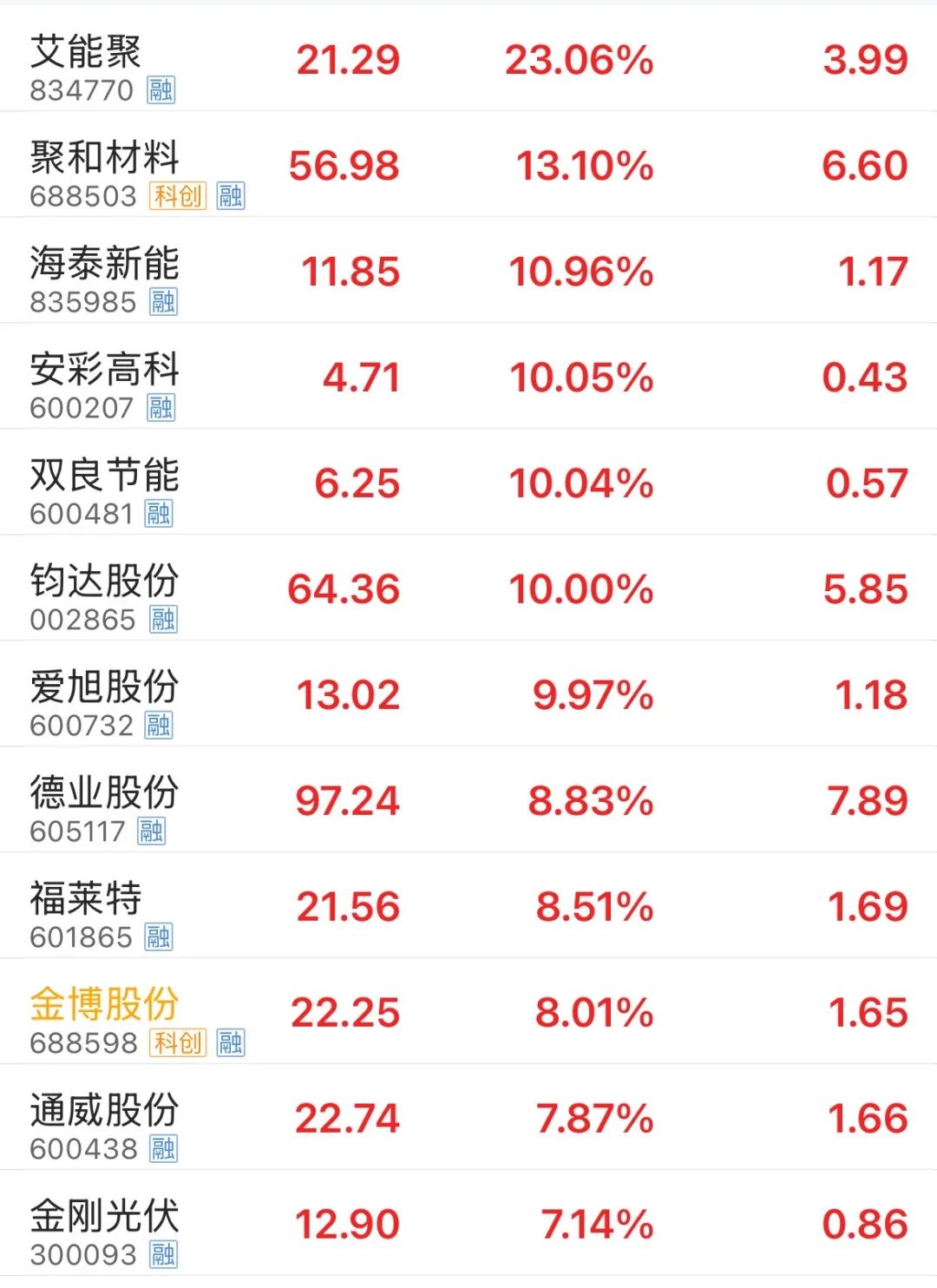 新能源概念股盘中同样走势活跃,光伏方向领涨。截至收盘,艾能聚涨超20%,聚和材料、海泰新能涨超10%,安彩高科、双良节能、钧达股份、爱旭股份涨停。
