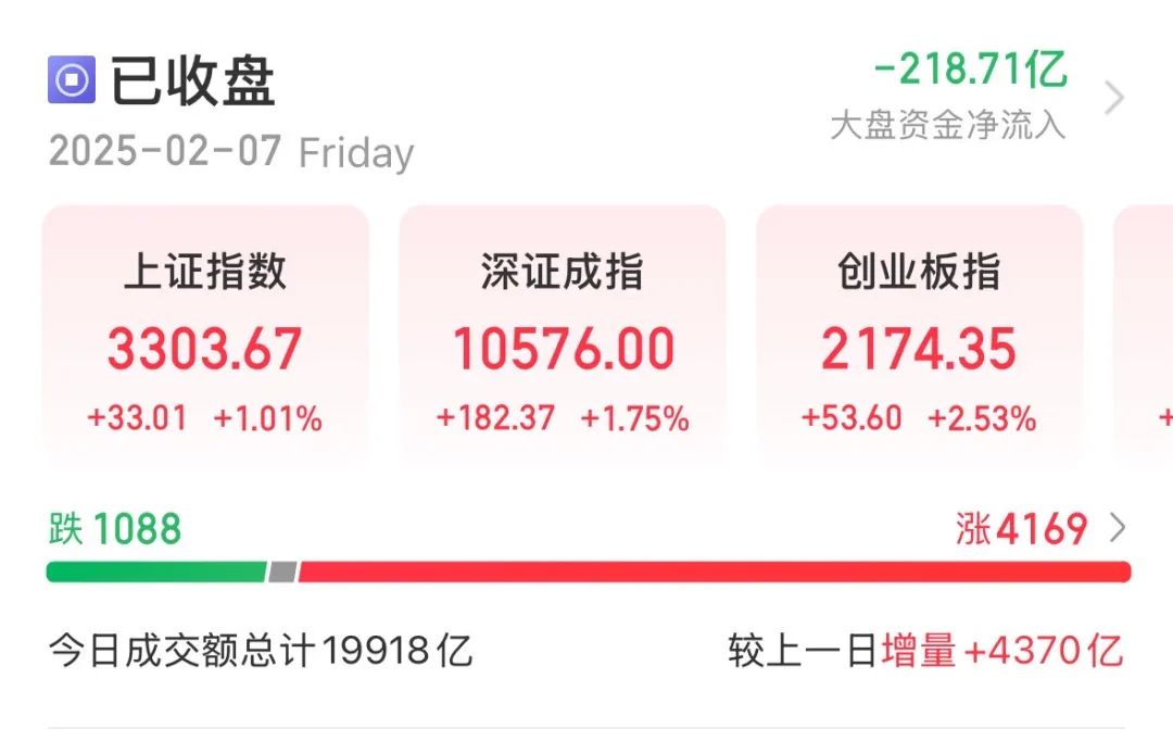 周五,A股市场全天冲高回落,沪指最终收盘站上3300点关口,北证50指数大涨近5%。截至收盘,上证指数报3303.67点,涨1.01%;深证成指报10576.00点,涨1.75%;创业板指报2174.35点,涨2.53%。