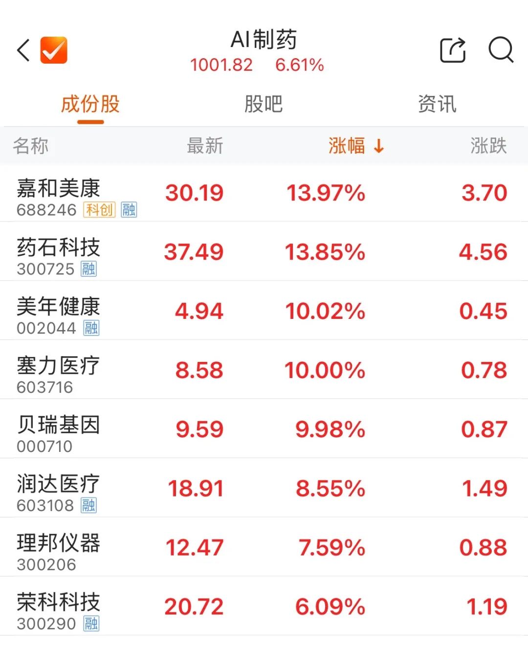 作为DeepSeek人工智能模型应用的一大方向,AI医疗板块持续表现活跃,卫宁健康盘中一度涨超19%。截至收盘,卫宁健康、嘉和美康、药石科技涨超10%,美年健康、塞力医疗、贝瑞基因涨停。