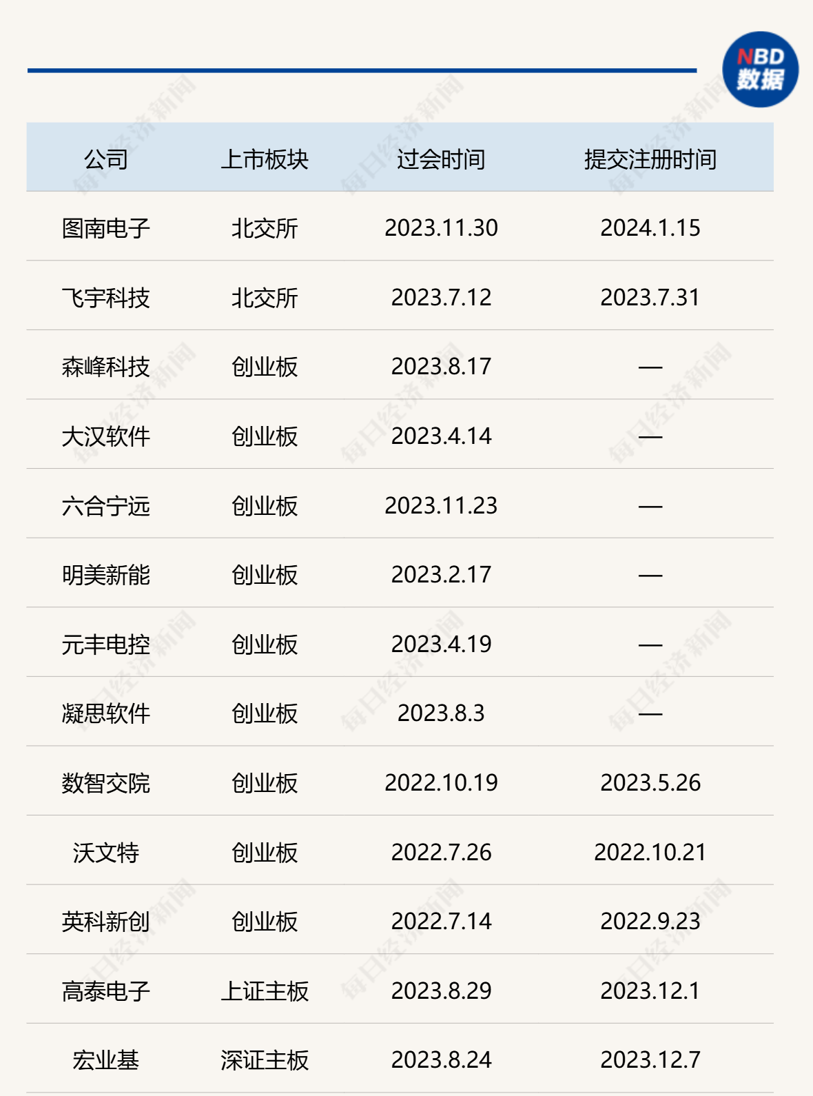 而上述13家已过会的终止IPO公司中,有7家公司此前已提交注册,分别为图南电子、飞宇科技、数智交院、沃文特、英科新创、高泰电子和宏业基,其中图南电子和飞宇科技系拟在北交所IPO。