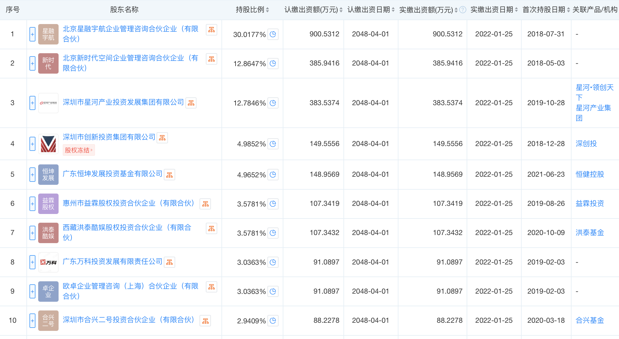 (图:工商信息显示的国星宇航前十大股东)