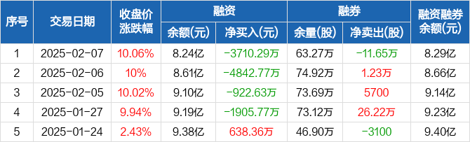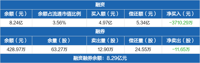 融资方面,当日融资买入4.97亿元,融资偿还5.34亿元,融资净偿还3710.29万元,连续4日净偿还累计1.14亿元。融券方面,融券卖出12.9万股,融券偿还24.55万股,融券余量63.27万股,融券余额428.97万元。融资融券余额合计8.29亿元。