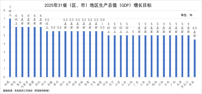 随着地方两会落幕,31个省(自治区、直辖市)均已公布2025年经济社会发展的主要预期目标。其中,有20个省份将地区生产总值(GDP)增长目标设在5%以上,27个省份将居民消费价格涨幅(CPI)设在2%左右。