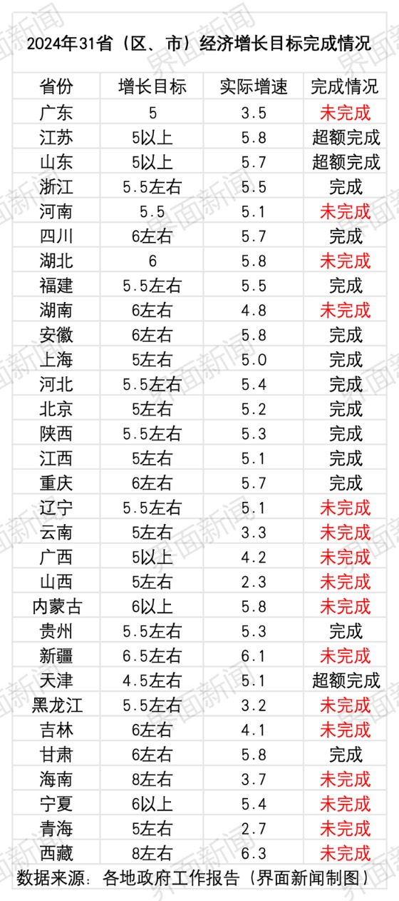 从地方公布的“成绩单”来看,2024年,地方经济减速换挡的特征比较明显。31个省份中,12个省份基本完成了年初的目标,3个省份超额完成了经济增长目标,而其余16个省份则没有完成年初设定的目标。
