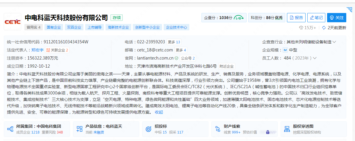 企查查显示,中电科蓝主要从事电能源材料、产品及系统的研发、生产、销售及服务,业务领域覆盖物理电源、化学电源、电源系统,以及其他产业链上下游产品,是中国目前科技实力雄厚、产业链最完整的电能源创新联合体,相继为载人航天、探月工程、火星探测、南极科考等重大工程项目提供可靠能源支撑。公司以“高效发电技术、致密储能技术、集成控制技术”三大核心技术为支撑,立足“空天电源、特种电源、绿色微网能源和共性基础”四大业务领域,加速薄膜太阳电池技术、固态电池技术、芯片化电源控制技术等迭代升级,加快钠离子电池技术、无线传能技术等前沿战略新兴领域成果转化,建成高效太阳电池、锂离子电池等自动化产线20条,具备全链条研发体系和数字化生产制造能力,为全球客户提供先进、安全、可靠的能源保障,为能源转型和绿色可持续发展提供电源方案。
