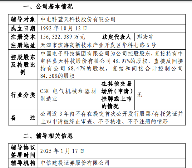 财中社2月8日电 中电科蓝天科技股份有限公司(下称“中电科蓝”)1月17日与中信建投(601066)签署上市辅导协议,并于近日向天津证监局提交了上市辅导备案报告。