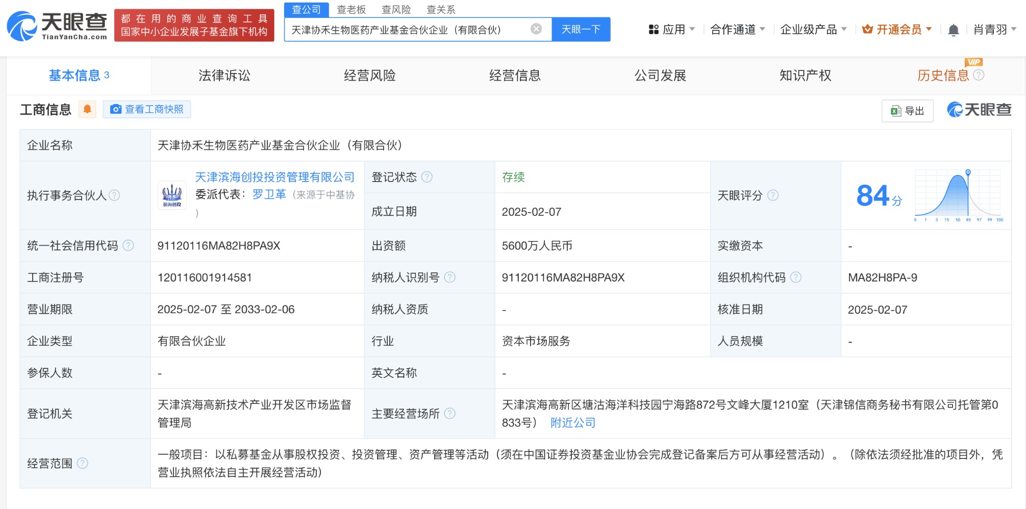 南方财经2月8日电,天眼查App显示,近日,天津协禾生物医药产业基金合伙企业(有限合伙)成立,执行事务合伙人为天津滨海创投投资管理有限公司,出资额5600万人民币,经营范围包括以私募基金从事股权投资、投资管理、资产管理等活动。合伙人信息显示,该基金由青岛海尔生物医疗股份有限公司、天津天开执信企业管理咨询合伙企业(有限合伙)、天津滨海创投投资管理有限公司共同出资。
