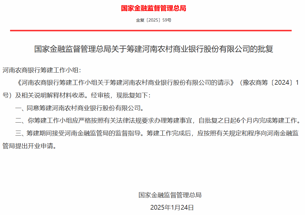 财中社2月8日电 国家金融监督管理总局发布公告,批复同意筹建河南农村商业银行股份有限公司(下称“河南农商行”)。